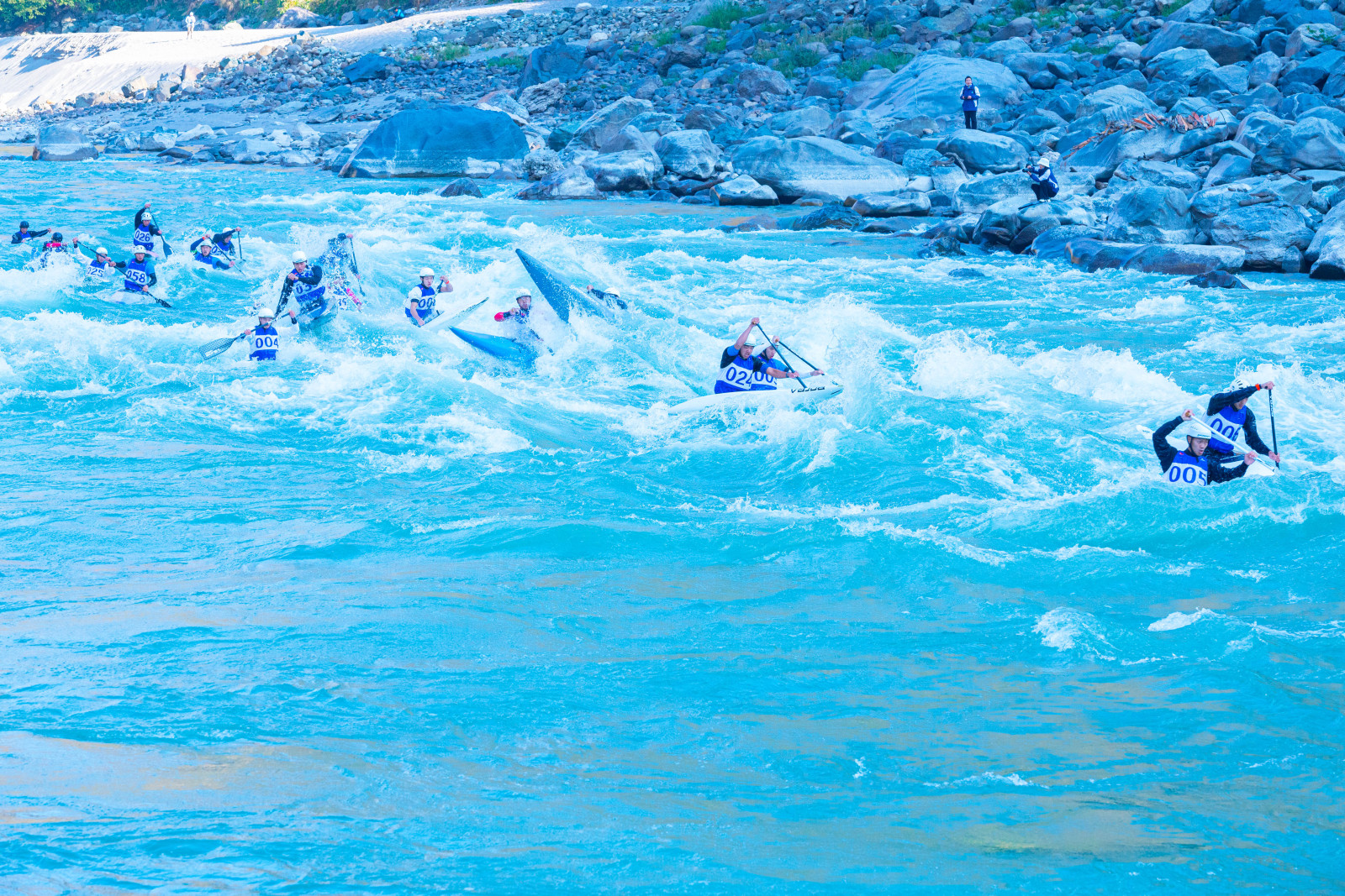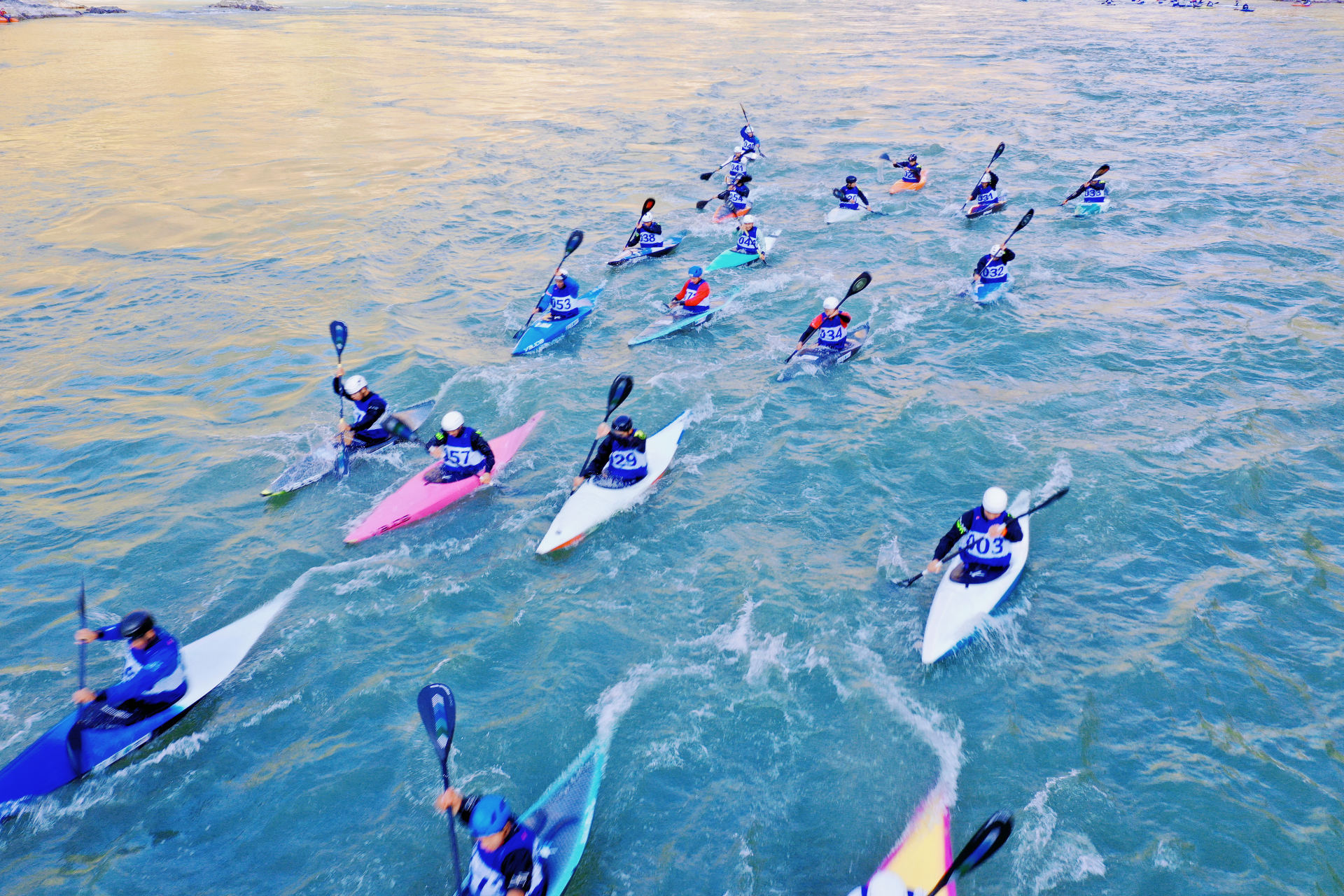 比赛开始后,首组运动员在第一个排浪处逐渐拉开距离,五颜六色的皮艇,形成一条漂浮在江中的彩带,让这条碧绿的江水瞬间灵动无限。
