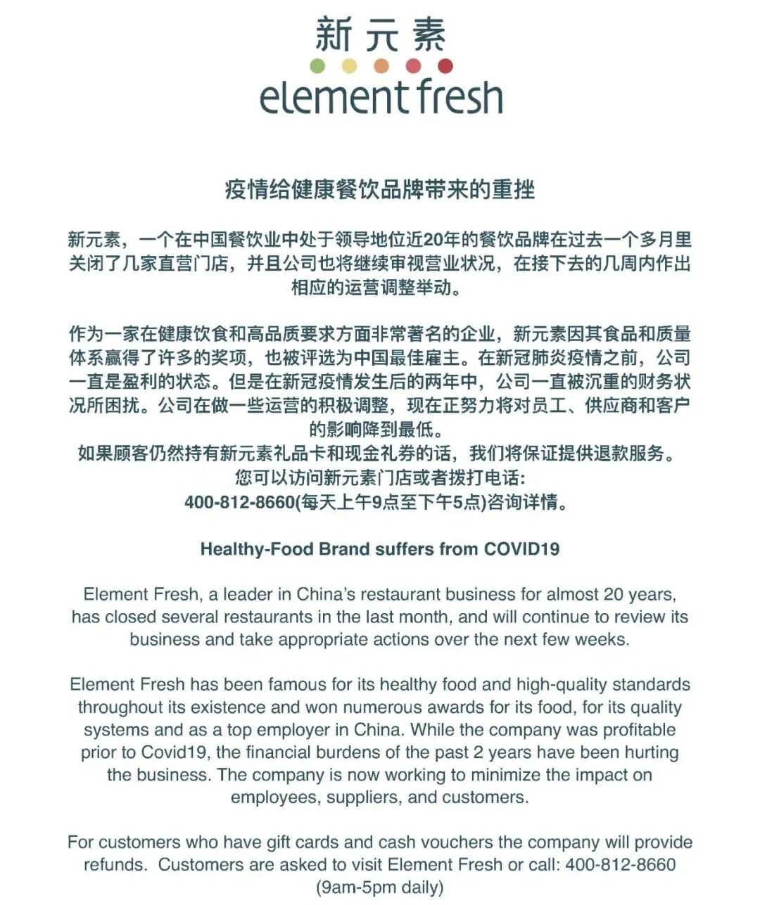 随后,新元素又发布题为《疫情给健康餐饮品牌带来的重挫》的公告。