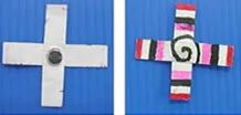 将卡纸剪成两段纸条,十字交叉后粘贴起来,就成了最简单的四叶轮造型。再将另1块磁铁粘在四叶轮中央。当然,我们还可以在四叶轮上用彩笔画一些有意思的图案,当它旋转起来时就就会呈现出漂亮的图案。
