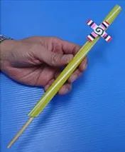 把1块磁铁以直立的形式用热熔胶粘在竹筷的顶端。这里需要注意的是,一定是让磁铁直立,而不是平放哦!