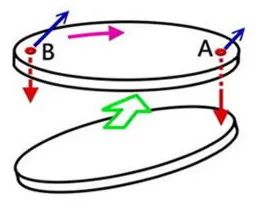 同时,如果磁铁与吸管在A点直接接触,可以把A点当作支点,让(引力小较易移动)的B点边移动边绕着A点转,因此磁铁以顺时针方向旋转(紫色箭头,由上往下看为顺时针)。而当下方磁铁运动方向相反时(与绿色箭头反方向),上方磁铁的转动方向也会跟着改变。