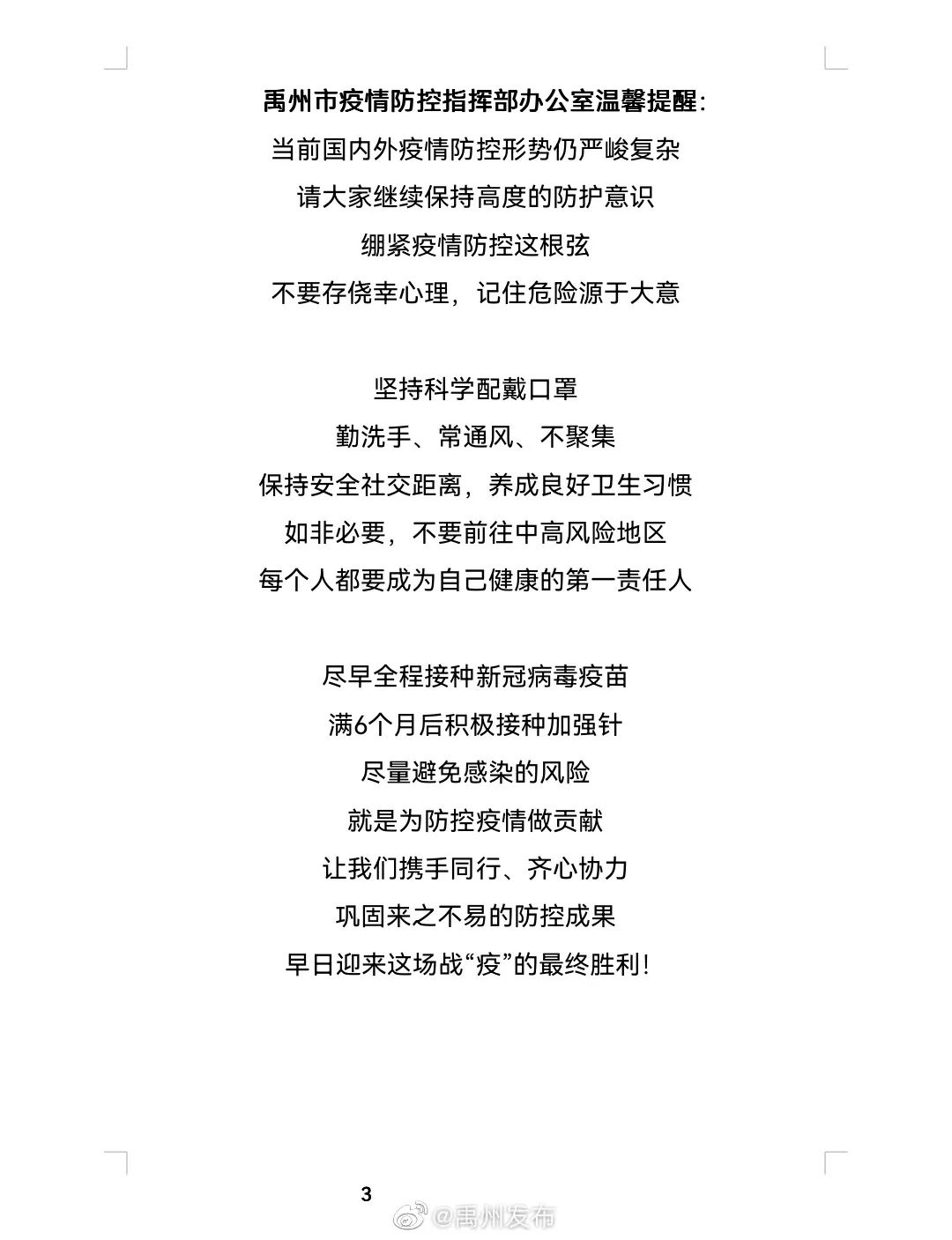 温馨提示:冬春季疫情防控形势依旧严峻,请广大市民要做好个人防护,正确佩戴口罩、勤洗手、常通风、不聚集。接种新冠病毒疫苗是阻断疫情最有效的手段,请广大市民积极进行疫苗接种,落实疫情常态化防控措施,共同构筑疫情防控坚固防线。