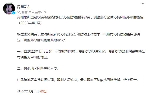 2)1月3日起,禹州市火龙镇刘沟村、夏都街道华庄社区、夏都街道欧亚陶瓷有限公司调整为中风险地区。3)禹州:全域只进不出,采取停运、停课、劝返等紧急措施。