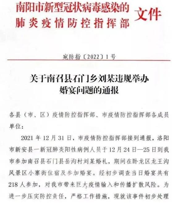 8)南阳南召县、卧龙区防疫管控不力被通报批评。洛阳市新安县一新冠肺炎阳性病例人员于12月24日-25日到南阳市参加南召县石门乡岳沟村刘某婚礼,期间在卧龙区龙王沟风景区小寨街住宿及参加婚宴。经初步调查当日婚宴共有218人参加。南召县、卧龙区对婚宴聚集活动管控不力,市“观念能力建设作风建设年”督察组启动问责程序,对相关单位及人员予以追责问责。