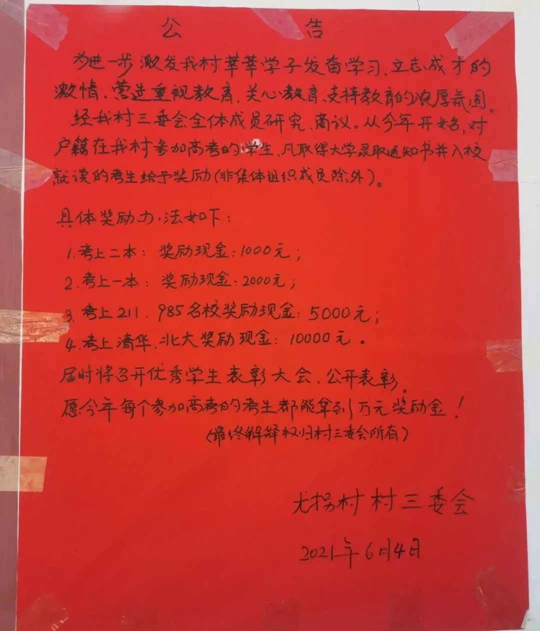4)2022年新年第一天,新乡市平原示范区桥北乡尤拐村举行了奖学金发放仪式,将奖牌及奖金送到2021年考上本科的四名学生家中。2021年6月,经尤拐村村三委研究,对户籍在本村参加高考被大学录取并入校就读的学生,村给予1000~10000元的奖励。尤拐村这一举动,传递出了尊师重教的正能量。