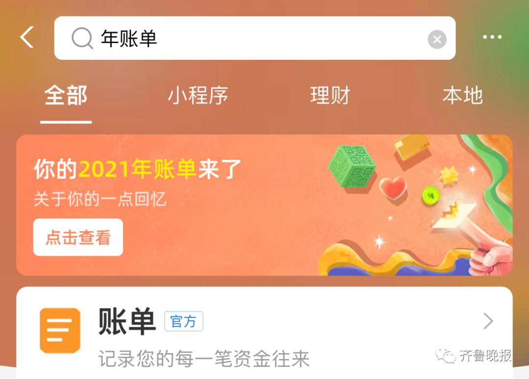 4)昨晚,一年一度的支付宝账单来了。打开支付宝,首页搜索“年度账单”,就会跳出了一个“2021支付宝年度账单”,点击进去就是你的账单啦。