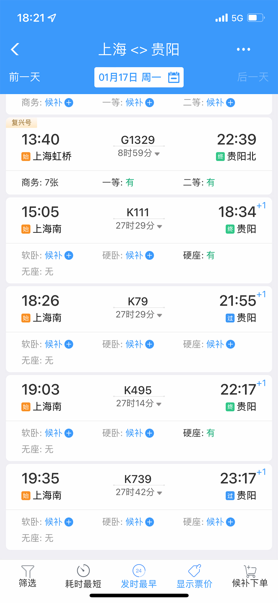 上海到贵阳共有15趟车次,显示有票的为9趟车次,其中,耗时在27小时的K字开头列车卧铺票已全部显示候补,上午8点至11点发车G开头的高铁票不太好卖。