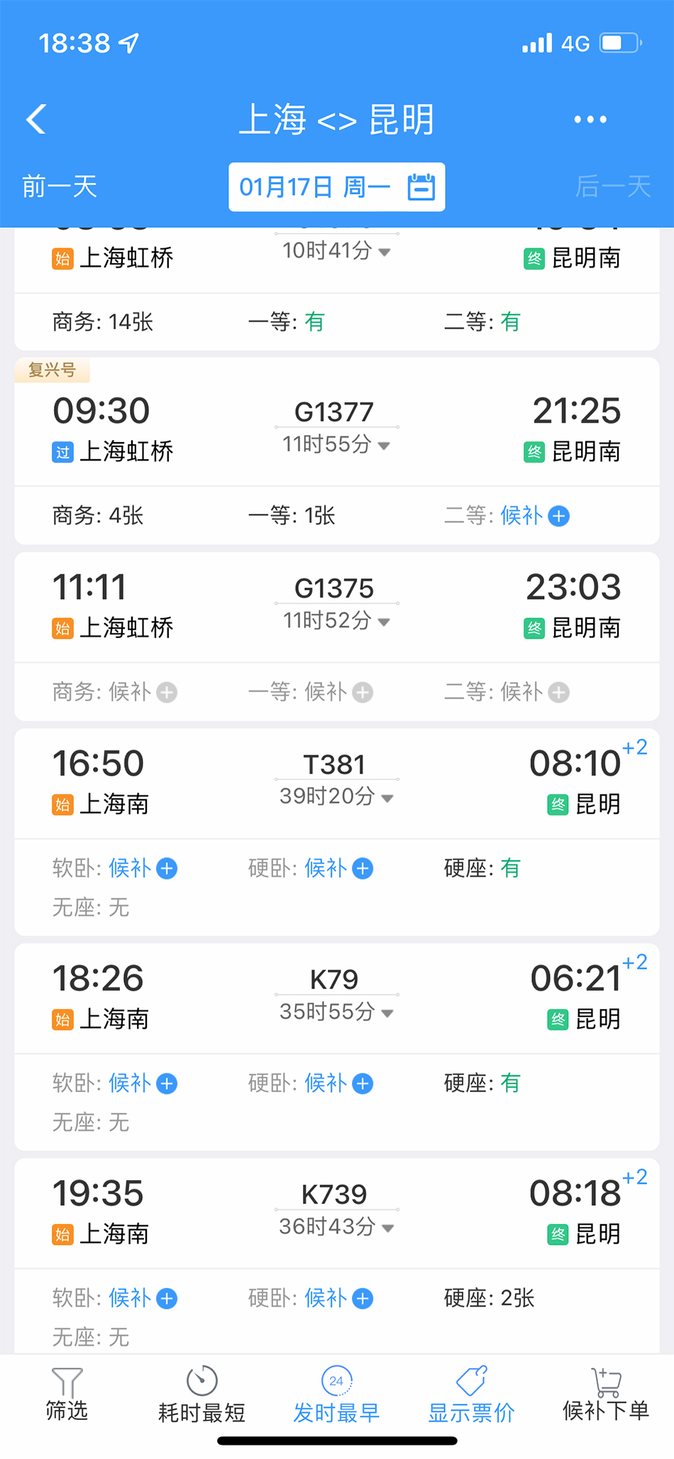 1月3日下午6点多,澎湃新闻记者登录12306手机客户端发现,1月17日春运第一天,上海到昆明,耗时在35小时以上的卧铺票已全部显示为候补,G开头的高铁列车也出现不同程度的候补,中午11点11分发车的高铁所有票已显示候补。