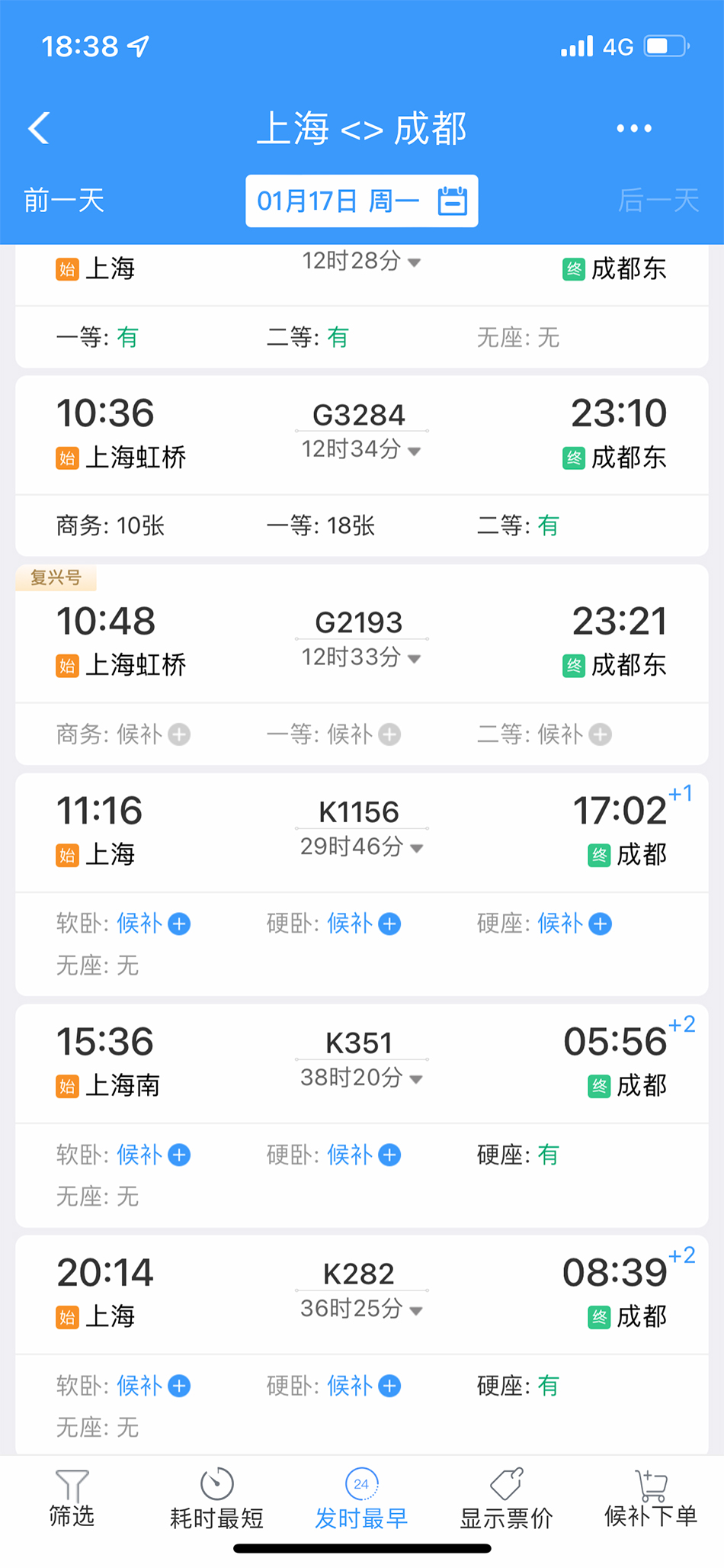 1月17日,上海到成都,K字开头列车的卧铺票已全部显示候补,G开头的高铁票也有部分车次显示候补。