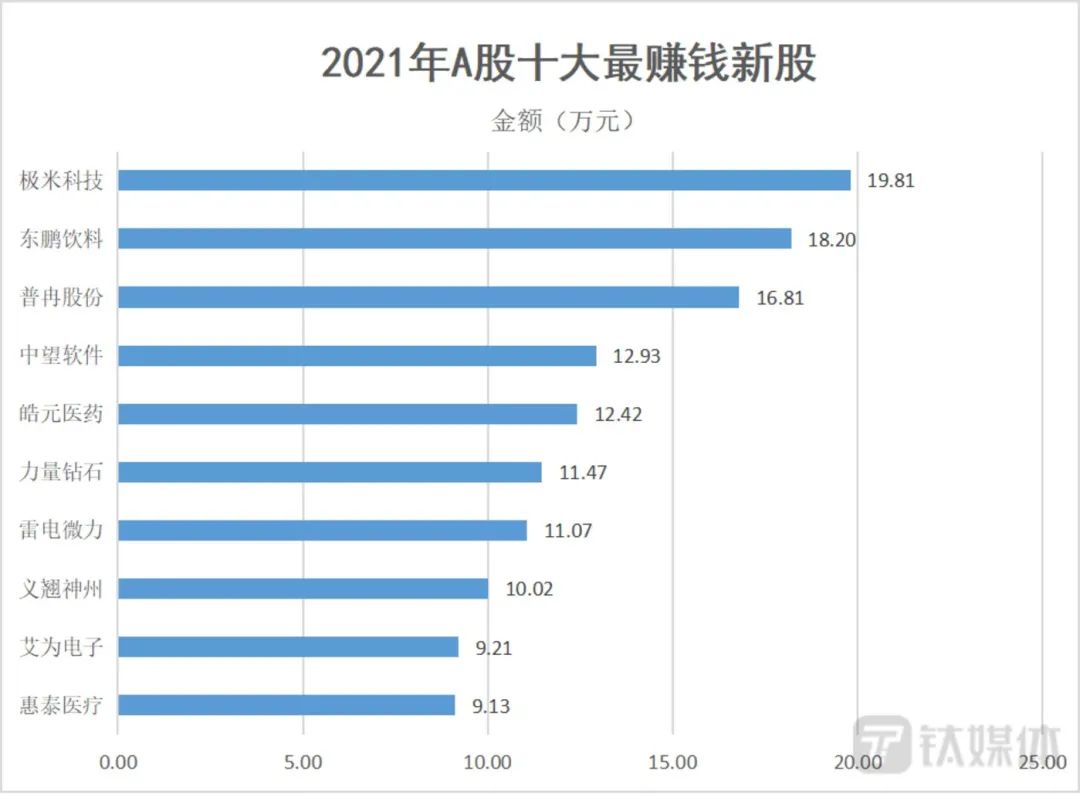 数据来源:Wind 钛媒体制图从打新收益来看,2021年打新最赚的10只新股,单签收益都在9万元以上,分别来自科创板(6只)、创业板(3只)和上证主板(1只);其中,科创板上市的极米科技,以单签19.81万元成为2021年最大“肉签”。