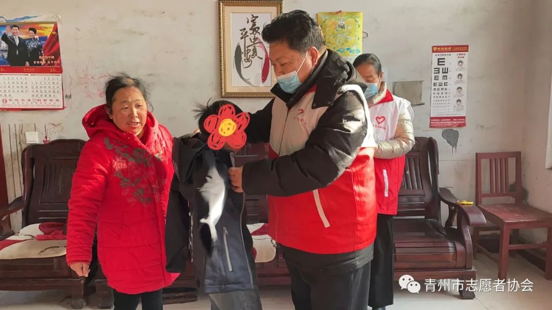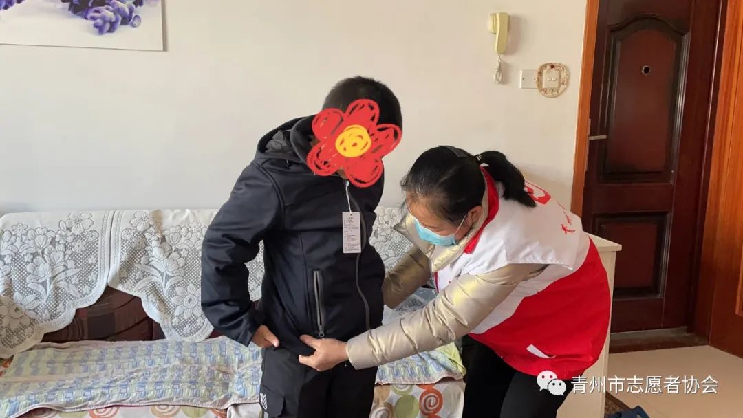一大早,志愿者们就来到青州市王府街道五里小学的7名品学兼优但家庭暂时困难的学生家中,为每一位学生送上冲锋衣和大米、食用油等生活物资。今年的冬天格外寒冷,可是有了冲锋衣的“保护”,孩子们一定会“暖身更暖心”。