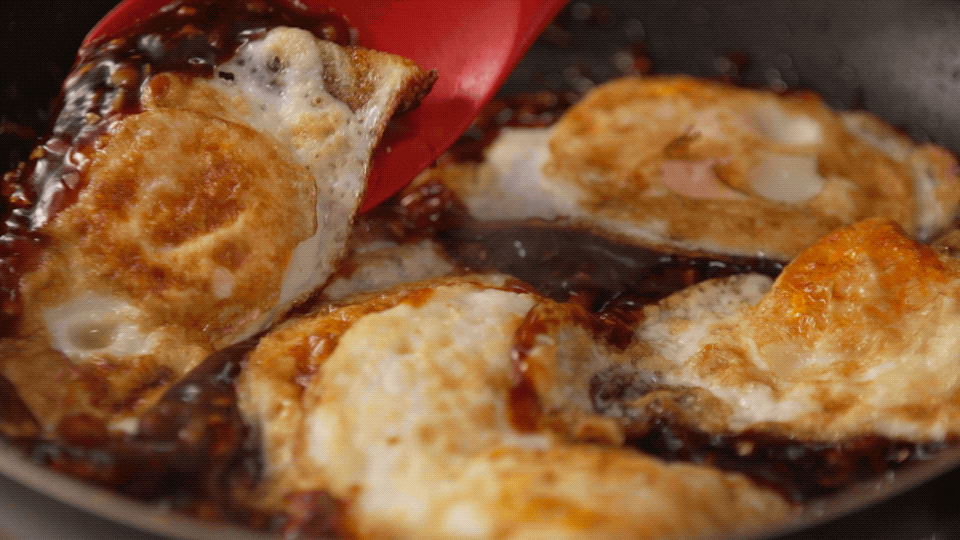 接下来煎荷包蛋,热锅冷油,注意煎鸡蛋的时候火不能太大,等它定型之后我们再轻轻翻面,煎到两面金黄后,就能夹出备用。剩下的油用来爆香蒜末,再倒入酱汁,煮开后加入荷包蛋,翻炒均匀,让每一个荷包蛋都均匀裹上酱汁,中火焖个3-4分钟,关火出锅撒上一点葱花更美味。