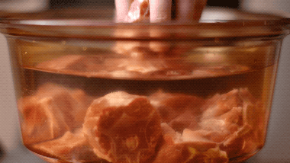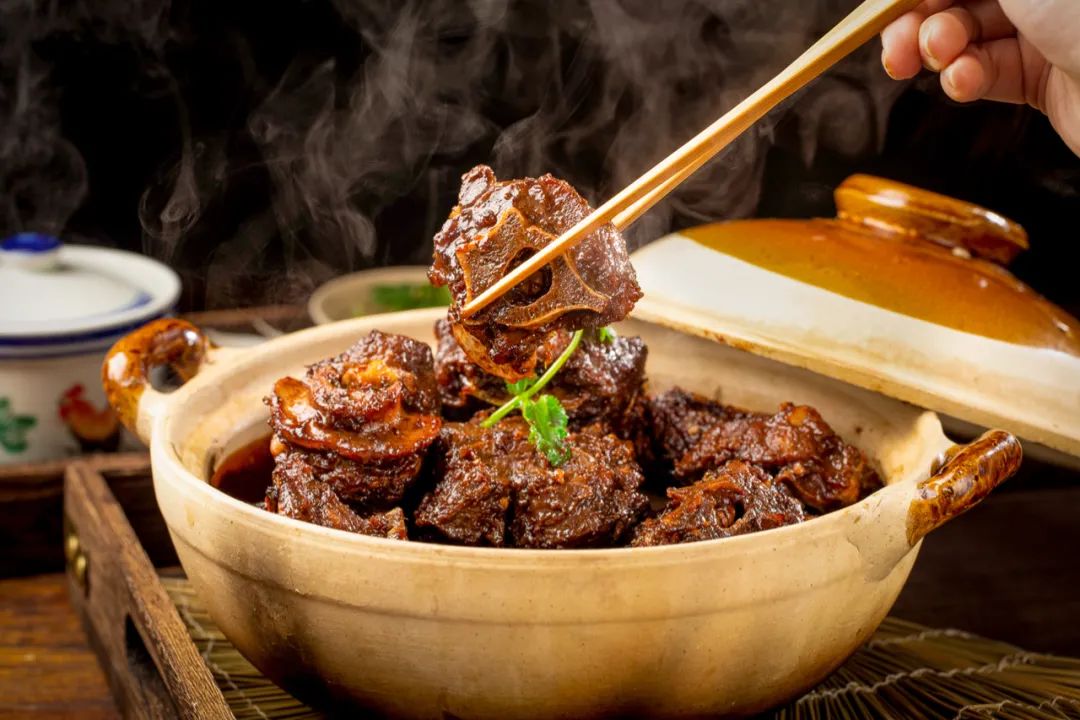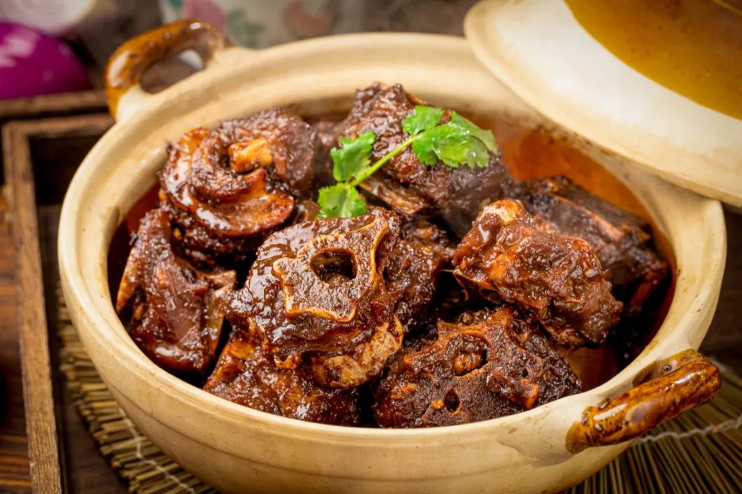 煮沸后,转小火,慢炖一个小时,把汤汁慢慢收干,羊蝎子炖到骨肉软烂,香气四溢,全部都上色后,我们就能盛出备用。