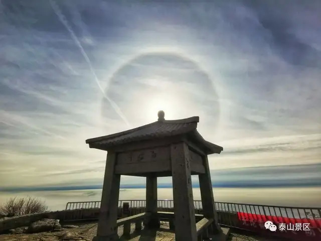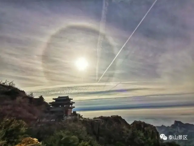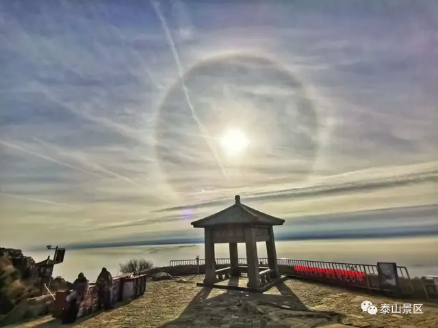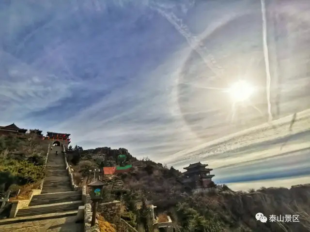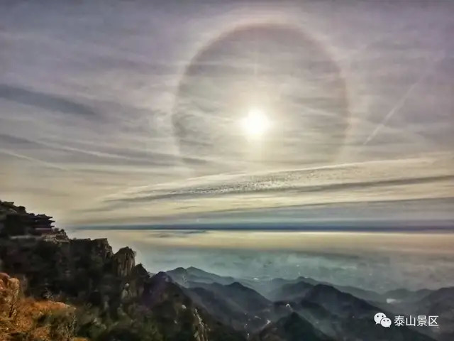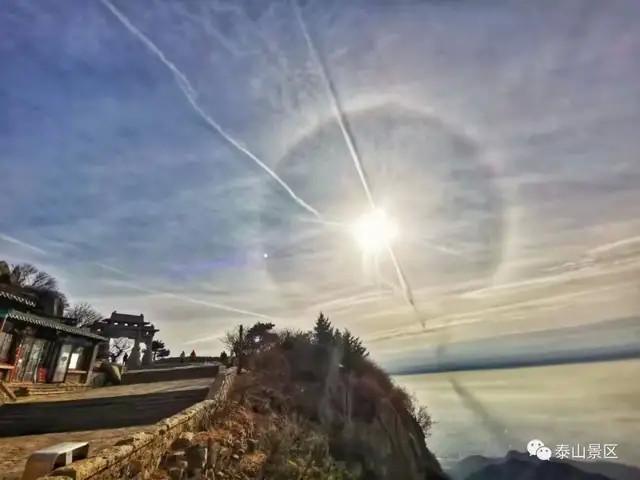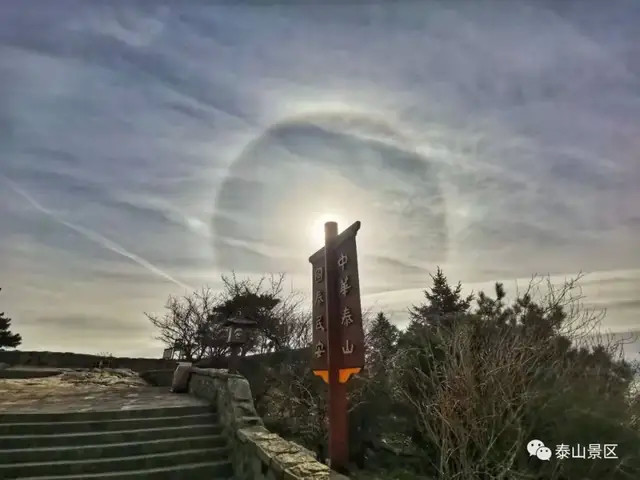 新年新气象。1月4日上午,泰山岱顶天气晴好,阳光在卷层云折射下出现了日晕奇观。只见太阳被一个硕大的光晕环绕,场面十分壮观,吸引了不少来泰山的游客驻足观看、拍照。而在不同地点拍摄出来的日晕也呈现出了不同的风格和韵味。令人惊奇的是,日晕上还出现了一个大大的“V”字,预示着新年大吉、诸事顺利。让我们一起来看看岱顶的日晕有多美丽吧。