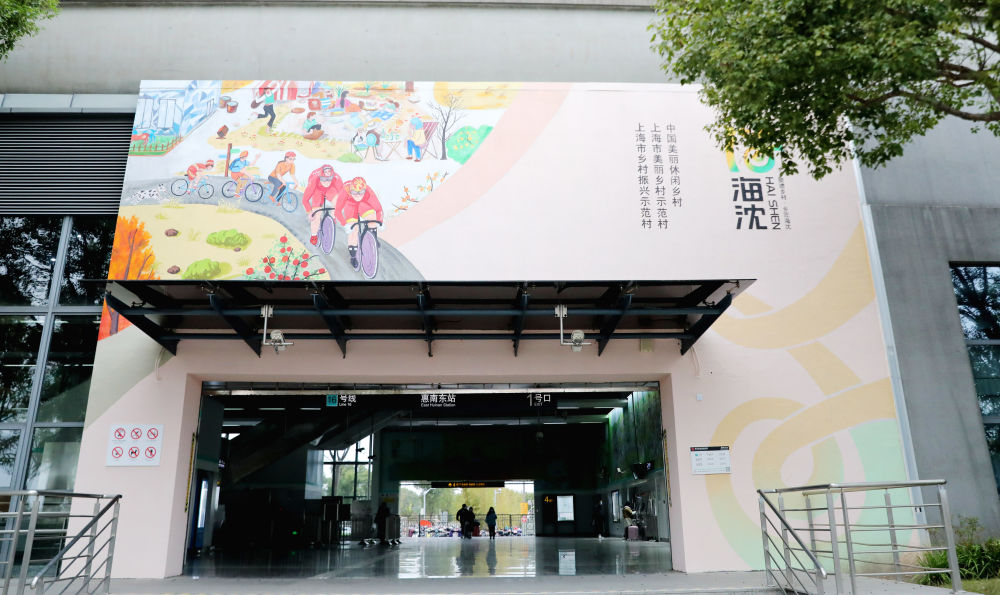乘坐上海地铁16号线,惠南东站下,整座车站内处处大幅壁画,画满一年四季的乡村元素。站前一条河,河上一座桥。走过“心愿桥”,首先映入眼帘的是“骑行驿站”,各类自行车任您挑选;骑行穿过大片稻田,眼前一座村,就是海沈村。
