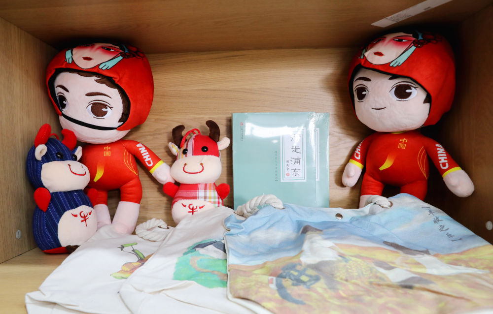 浦东新区惠南镇海沈村一处文创中心内摆饰的以钟天使为原型创作的卡通形象“海小天”公仔。
