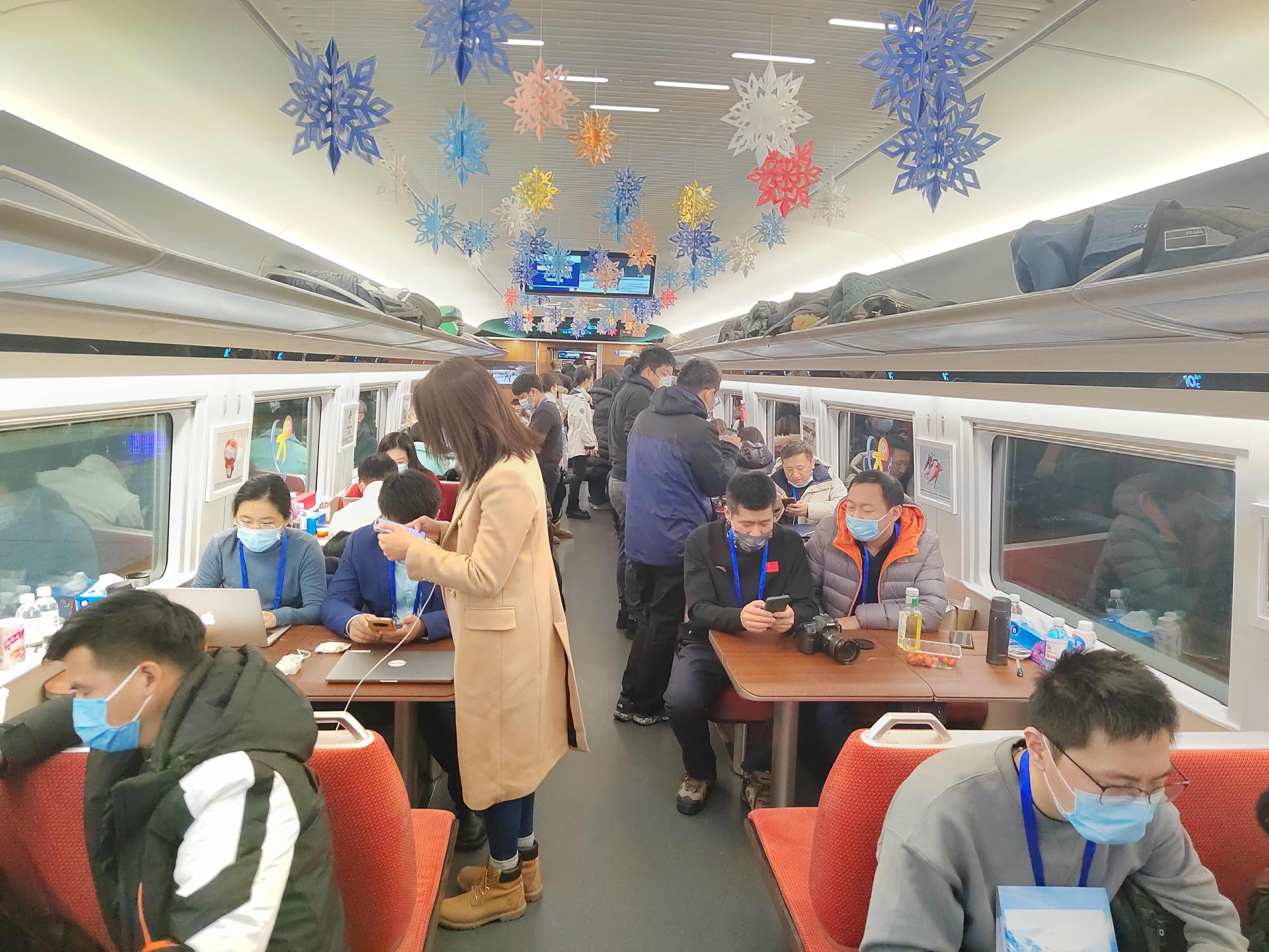 动车组5号车厢为多功能车厢,设置媒体工作区,提供12个办公桌以及国际通用插座、可推拉小桌板等设施,可容纳48人就坐,为媒体人员提供办公环境;同时可实现5G高清赛事直播,具备6个频道4K直播能力;车厢顶部采用放射性蓝色灯光,契合冬奥会的冰雪主题;5号车厢的开放式餐吧区以冰蓝色为主基调,被称为“2022北京奥运蓝”,体现冬奥健儿拼搏精神。