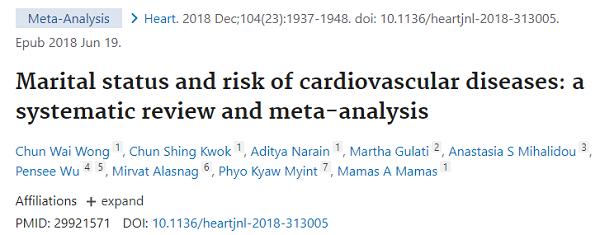 [1]Wai W C , Shing K C , Aditya N , et al. Marital status and risk of cardiovascular diseases: a systematic review and meta-analysis[J].Heart, 2018:heartjnl-2018-313005-.