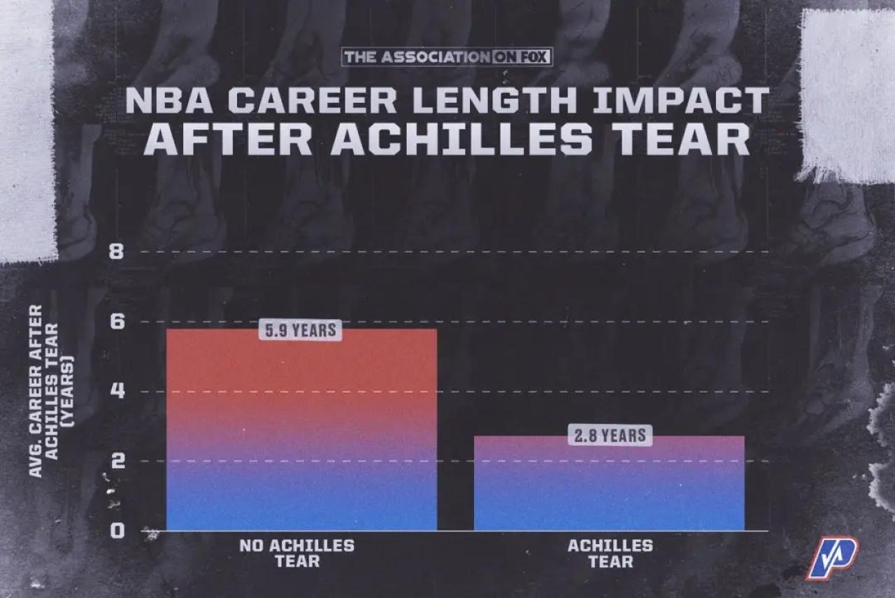 很多我们耳熟能详的NBA球星都遭遇过这个伤病。比如科比,考辛斯,杜兰特。2020年11月《体育医学骨科杂志》对47名1970年至2019年遭受跟腱断裂的NBA运动员进行了研究,结果表明:在伤前他们有着平均5.9年的NBA生涯;跟腱断裂后,他们的NBA生涯降到了2.8年。