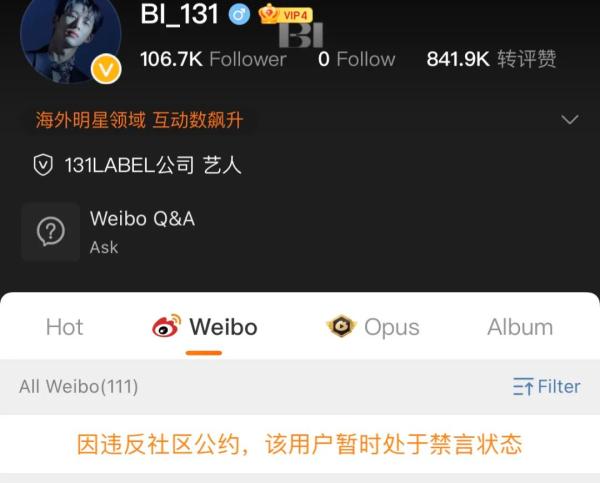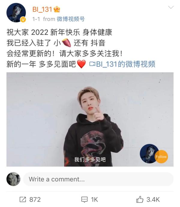 然而近日,有中国网友发现,去年9月因吸毒被判3年、缓期4年执行的韩国歌手B.I(本名金韩彬)继去年开通微博后,今年元旦一口气开通了小红书和抖音账号,并喊话中国粉丝“我们多多见吧”。