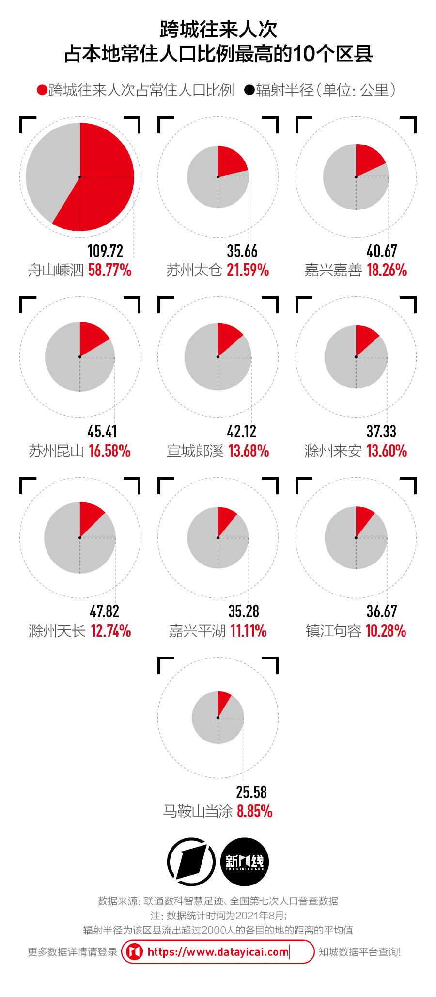 新一酱以各区县流出超过2000人的各目的地距离的平均值,计算出了各区县的辐射半径。与南京六合、扬州仪征、扬州高邮都保持着高频往来的滁州天长,其辐射半径达到了47公里;嘉善、昆山等环上海活跃区县的辐射半径也都超过了40公里。