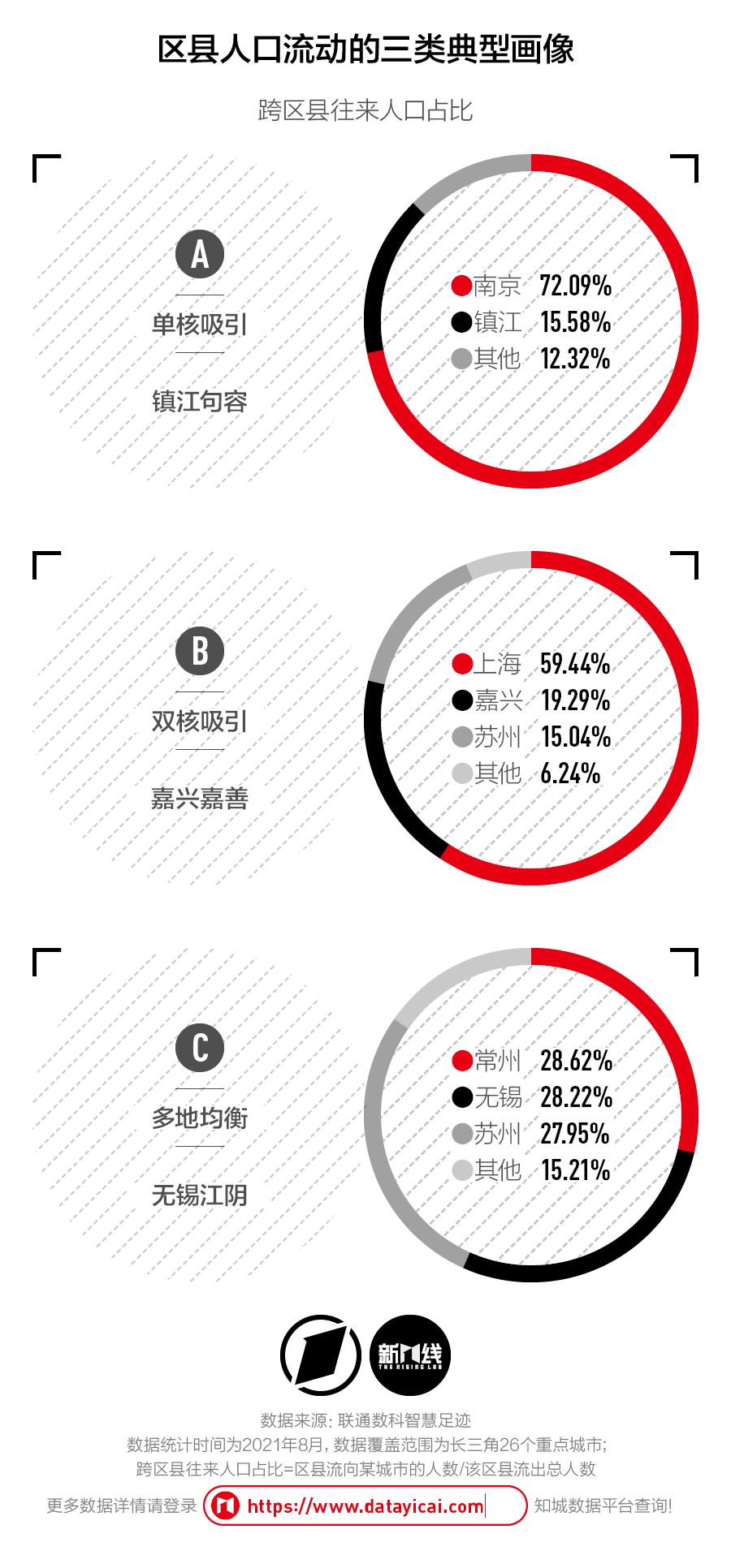 大城市对与其接壤的外市区县有很强的吸引效应。以镇江句容为代表,它与南京之间的跨城往来占到了所有出行人次的72.09%,与镇江本地的往来仅为15.58%。昆山、太仓也同属于这种类型。