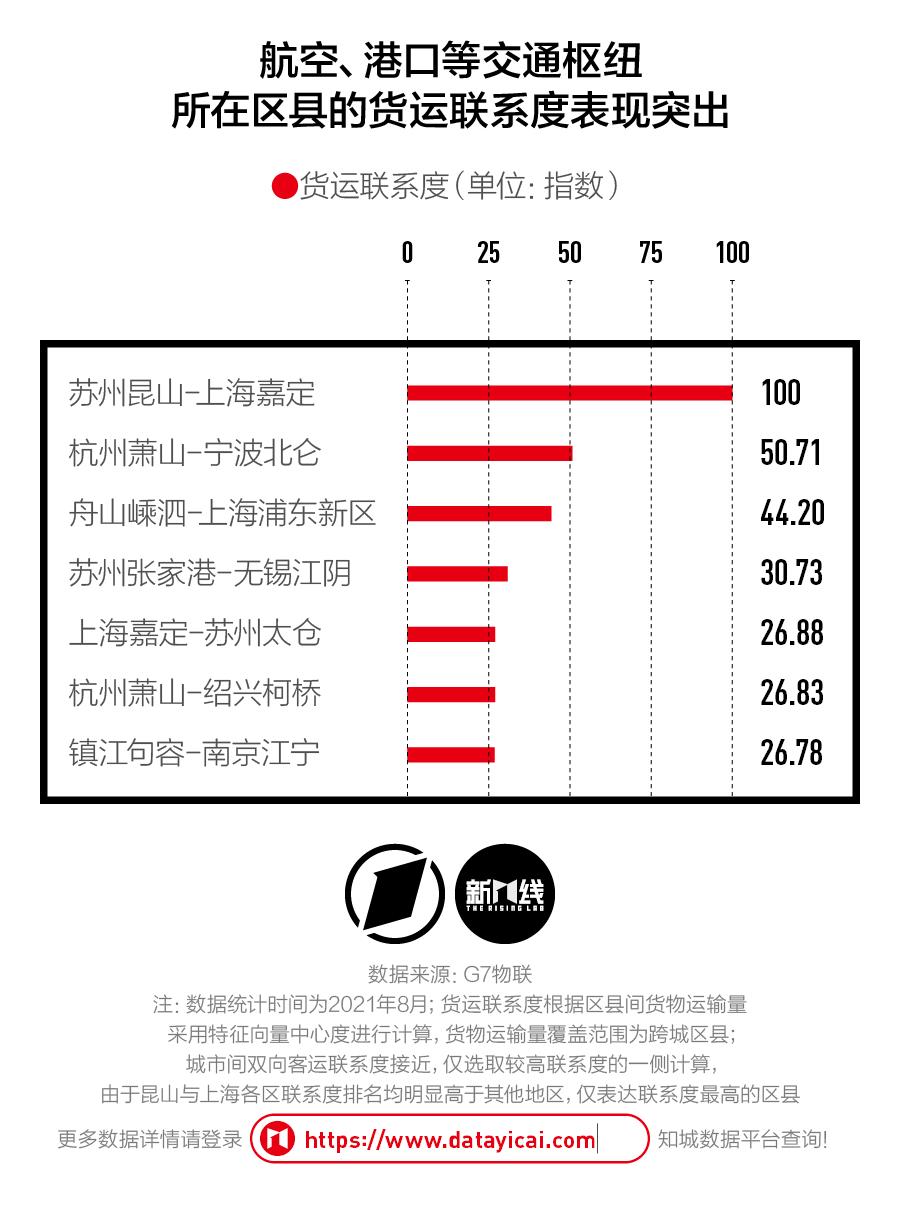 数据显示,在长三角41个城市的跨城货运联系中,上海嘉定与苏州昆山的联系度依然高居首位。在其他排名靠前的联系区县中,还有萧山-北仑、嵊泗-浦东、萧山-柯桥等区县。作为重要的航空枢纽、海运港口所在地,这些区县承载了大量的货物集散功能,是区域内物流联系的核心节点。