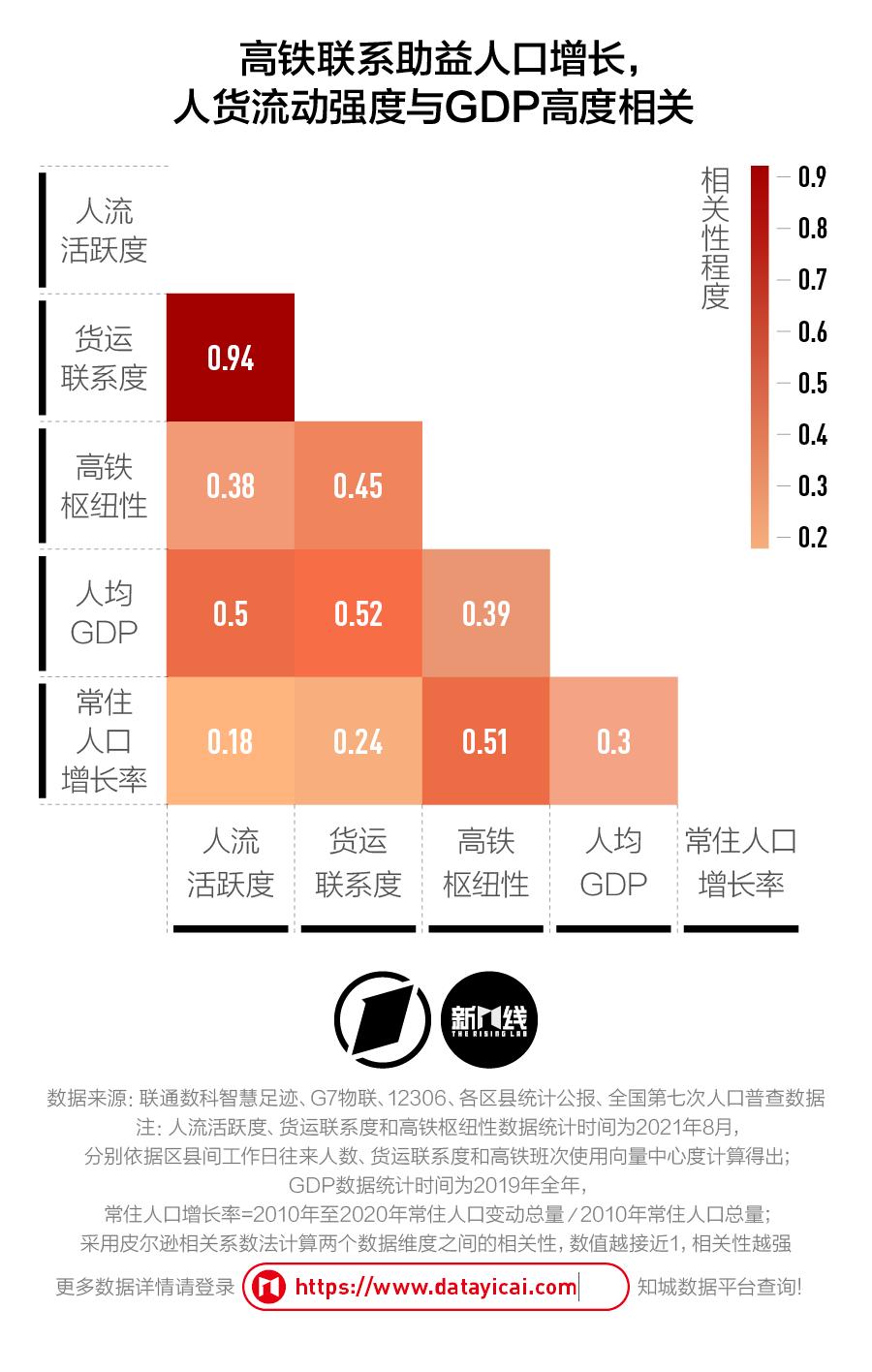 结果显示,人口往来和货物流动之间高度相关,而且它们都与区县的人均GDP数据表现出了关联性。这也就意味着,那些人货流动频繁的区县,往往有着更强的经济产出。此外,那些高铁发达的区县,普遍在过去十年里吸引了更多常住人口的涌入。