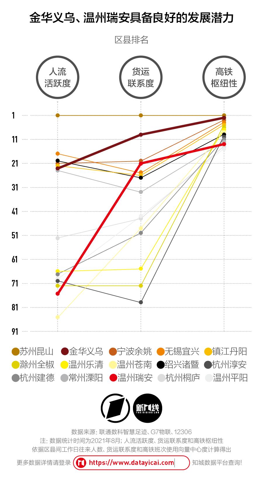 金华义乌和温州瑞安,是少数两个在人货表现上有较大差值的市县。它们的货运联系度表现较好,说明已在区域间建立了相对活跃的经济活动;但人流的联系不佳,提示可能正处于对制造业较高依赖、现代服务业网络待提升的转型状态。