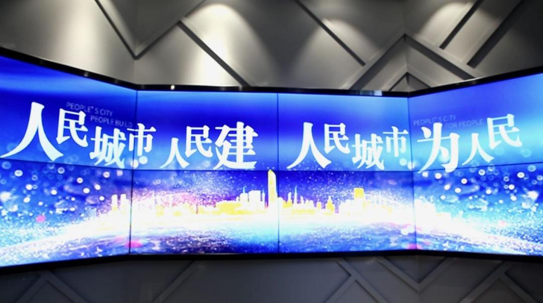 这里采用了三折宽屏设计,将打造公园城市直播间。日常我们通过一部宣传短片向大家介绍杨浦是如何从“工业锈带”变成“生活秀带”,以及如何走向“生态绣带”。