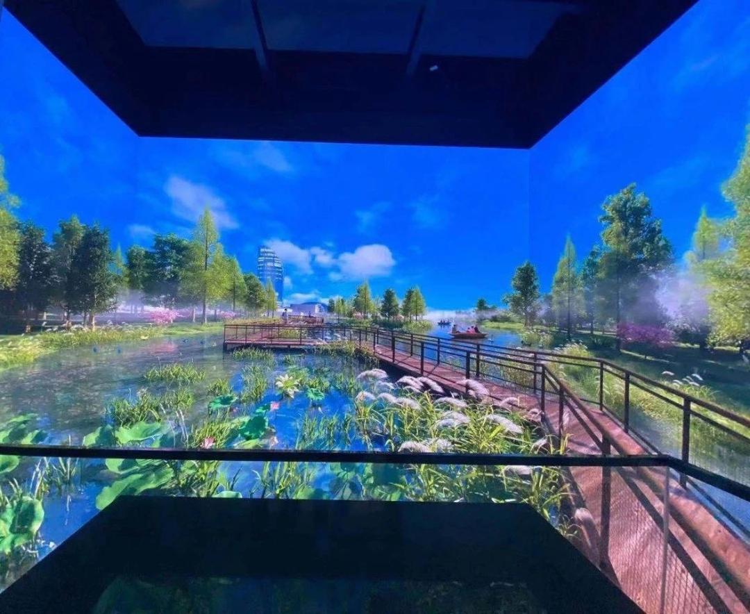 这里打造的是未来家庭生活阳台的沉浸式体验厅。这里将为大家呈现一场美妙的视听盛宴,通过晨昏变化,四季更替,感受未来公园城市建设将会给每一位市民带来的如画一般的生活日常。