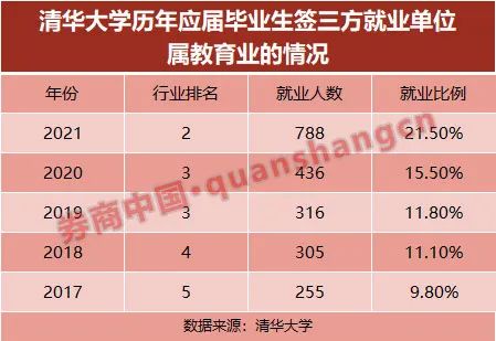 从历年趋势来看,清华学子到教育行业就业人数持续增长,2017年仅有255人(本科生、硕士生、博士生数据合计),就业比例不到10%,排名第5;如今教育业就业比例已经突破20%,2021年以21.5%比例上升至第2位。