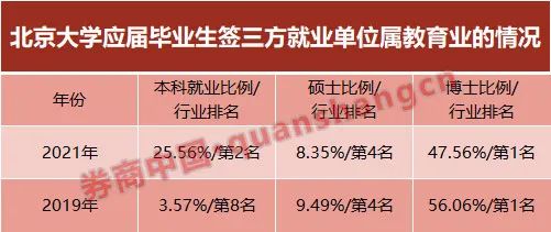 而在北京大学,2021年共有25.56%的本科生在教育行业就业,排名第2;相比两年前有较大幅度的提升,2019年仅有3.57%本科生在教育行业,行业排名第8。