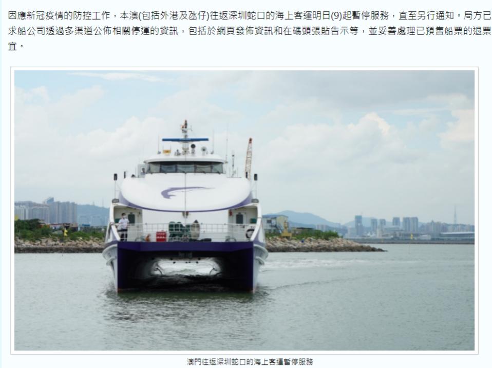 受疫情影响,深圳蛇口到澳门的游轮航线也被暂停。澳门特区政府海事及水务局1月8日晚间发布消息称,为防控新冠肺炎疫情,澳门(包括外港及氹仔)往返深圳蛇口的海上客运9日起暂停服务,直至另行通知。