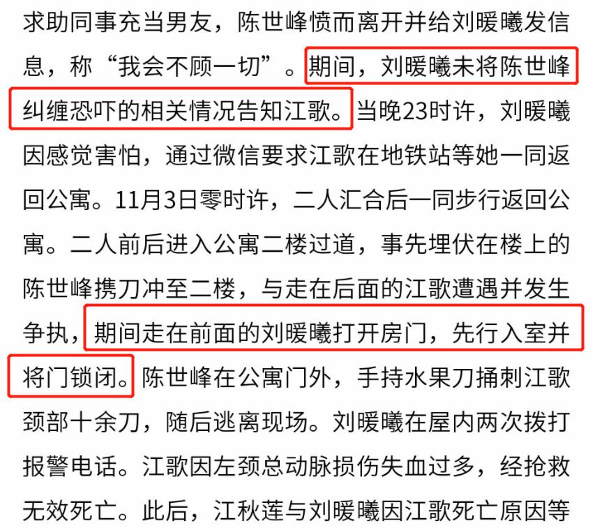 据法院一审宣判,案发当日两人结伴回家。事先埋伏在楼上的陈世峰携刀冲至二楼,与走在后面的江歌遭遇并发生争执,期间走在前面的刘暖曦打开房门,先行入室并将门锁闭。陈世峰在公寓门外,手持水果刀捅刺江歌颈部十余刀,随后逃离现场。刘暖曦在屋内两次拨打报警电话。