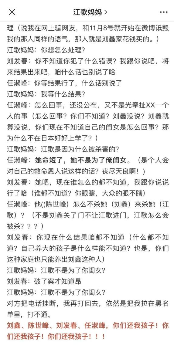 江歌妈妈公众号上的通话录音文字版江歌遇害第294天,新京报旗下《局面》栏目终于促成了江秋莲与刘鑫的第一次见面。伴随节目上线,江歌之死再次引发关注。但遗憾的是,尽管节目旨在探讨“悲剧发生后次生伤害的成因”,主持人王志安也在微博发言“不要简单辱骂刘鑫和她的家人”,而点赞最多的评论是:“不要简单辱骂,要复杂辱骂。”
