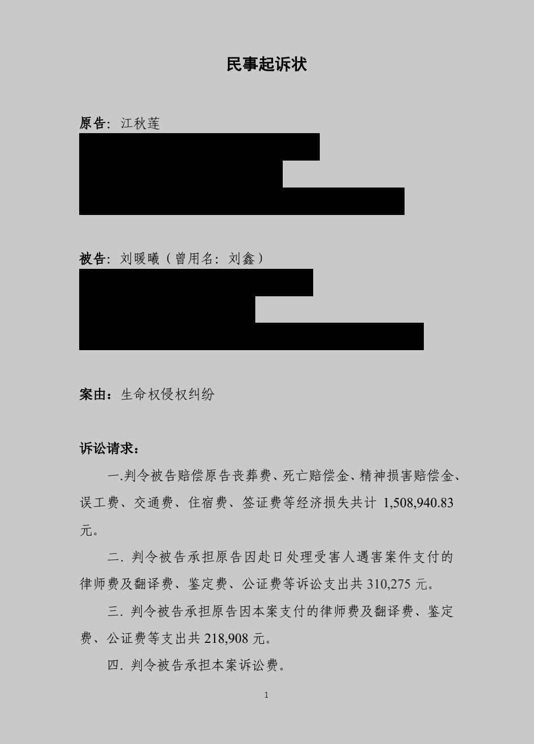 江秋莲的民事起诉状 / 澎湃新闻从公布的一审判决来看,法院对江秋莲方的起诉理由作出了部分认定。判决书指出刘鑫未将陈世峰恐吓一事告知江歌、并且在进入房间后锁门;在赔偿方面,刘鑫被判赔偿江秋莲各项经济损失496000元及精神损害抚慰金200000元,但对于江秋莲主张的其他经济损失,不予支持。