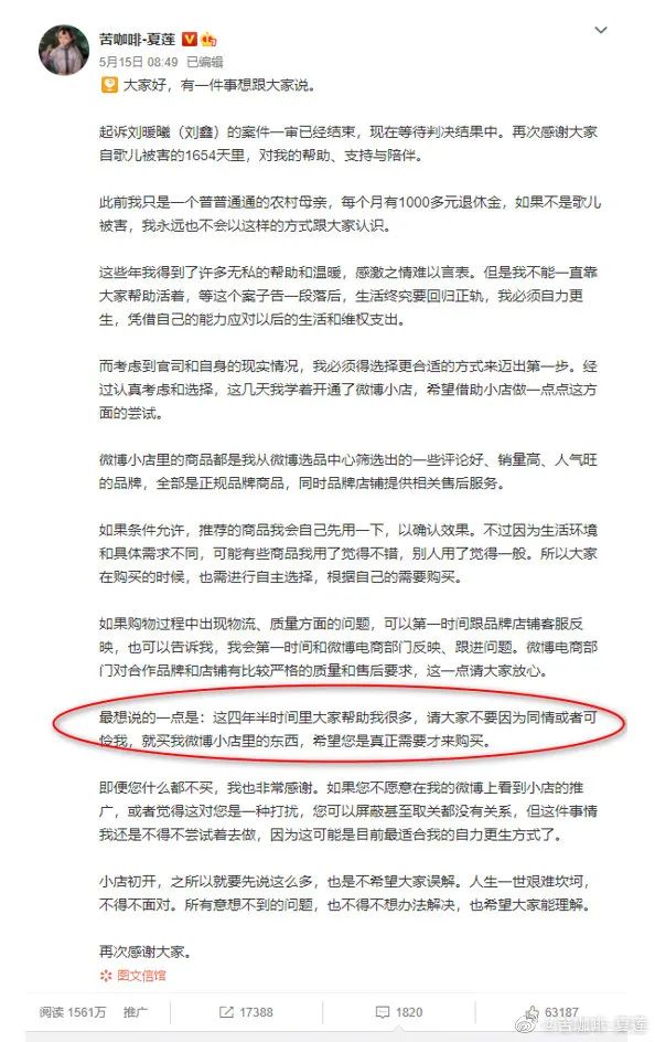 江秋莲开店时的微博不久之后,同样是新闻苦主、同样带货的林生斌人设翻车,一时之间还有“预言家”出来预言江母的翻车。江秋莲在自己的微博写下:“因为爱女江歌被害,因为江歌妈妈这个身份,我想做一个普通的电商店主都要备受非议”。对此,新京报评论曾指出:须分清的是,受害者带货不是为了赚钱而“卖惨”,而是在遭遇不幸或不公以后,尝试开启新的人生。对他们过上更好生活的努力,不应该阻拦和苛责。