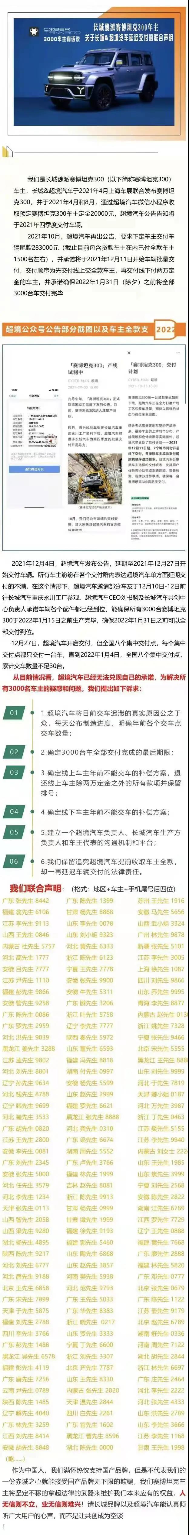 声明中称,因超境汽车多次单方面延长旗下赛博坦克300的交付日期,其3000名准车主联合对其提出包括确保最终交车期限、确定补偿方案、公布造车进度等在内的六大诉求。