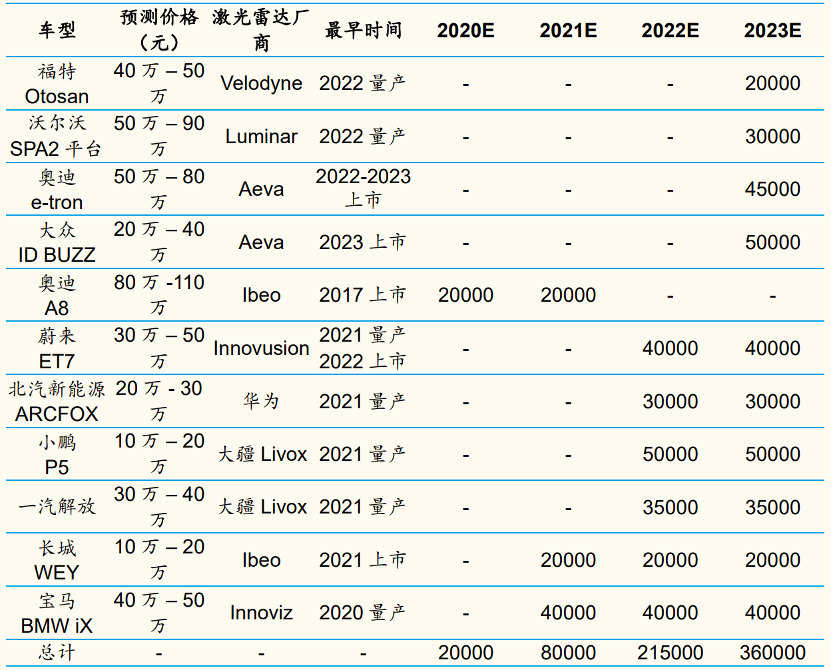整车厂已宣布搭载激光雷达量产车型价格区间、产量预测(台)来源:国金证券研究所