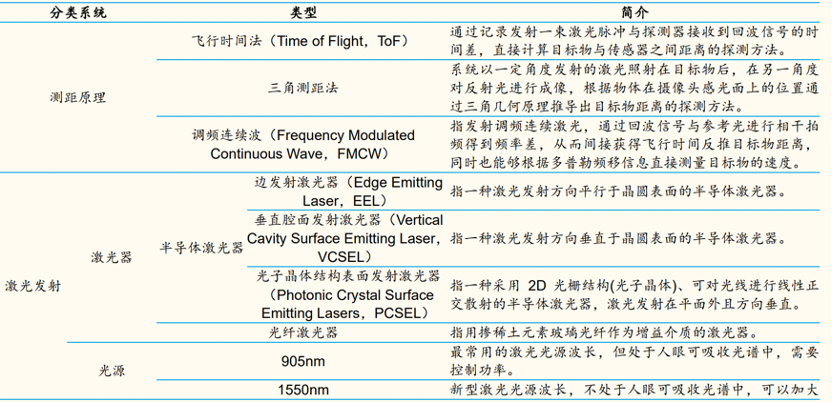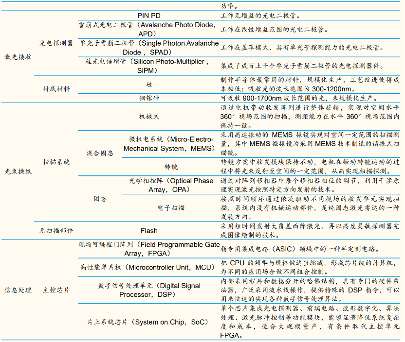 激光雷达常以线数区分,线数指激光发射的光源数,如128线产品有128个光源。按扫描方式划分,激光雷达扫描方式有无机械转动部件可以分为机械式、半固态、固态。混合固态分为 MEMS、转镜,纯固态分为相控阵 OPA、Flash。激光雷达在测距原理、激光发射、激光接收、光束操纵及信息处理等五个方面均存在不同技术路线。
