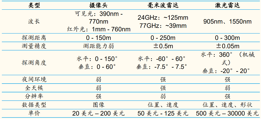 不同传感器对比 来源:汽车人参考,中汽中心