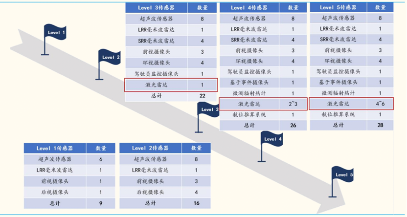 随着自动驾驶级别提高,激光雷达配备数量需求增加。来源:麦姆斯咨询,国金证券研究所