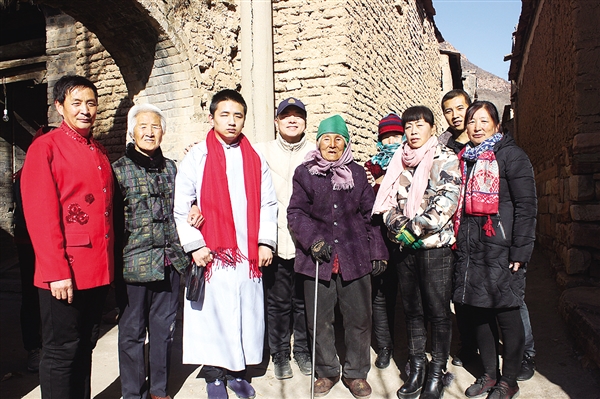 《日出边村》在左权县古村落桃园村演出结束后,刘红庆(左四)与演职人员及村民留影。