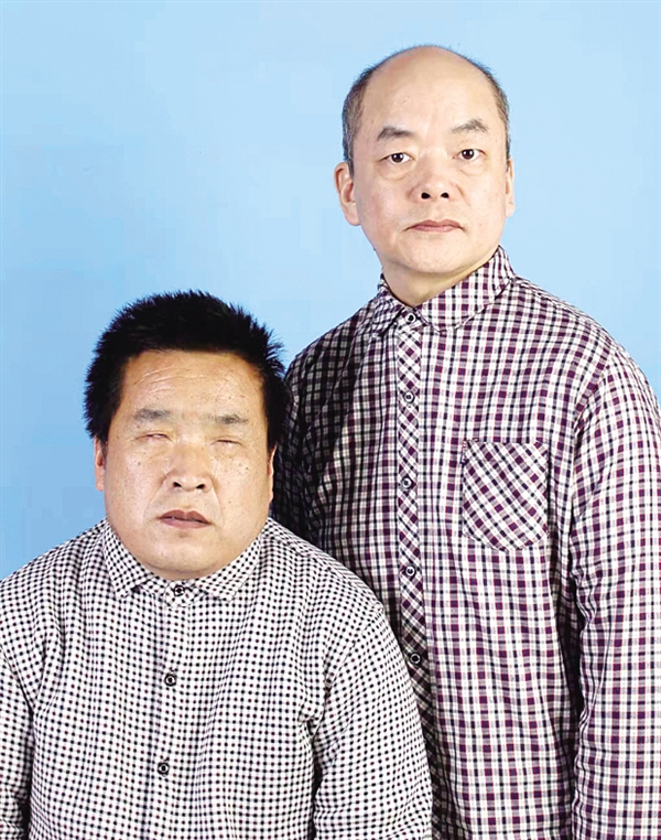 刘红庆和弟弟刘红权童年时六一儿童节母亲带他们拍了合影,为了配合亚妮电影《没眼人》的拍摄,前几年俩人又同框拍摄了这张照片。