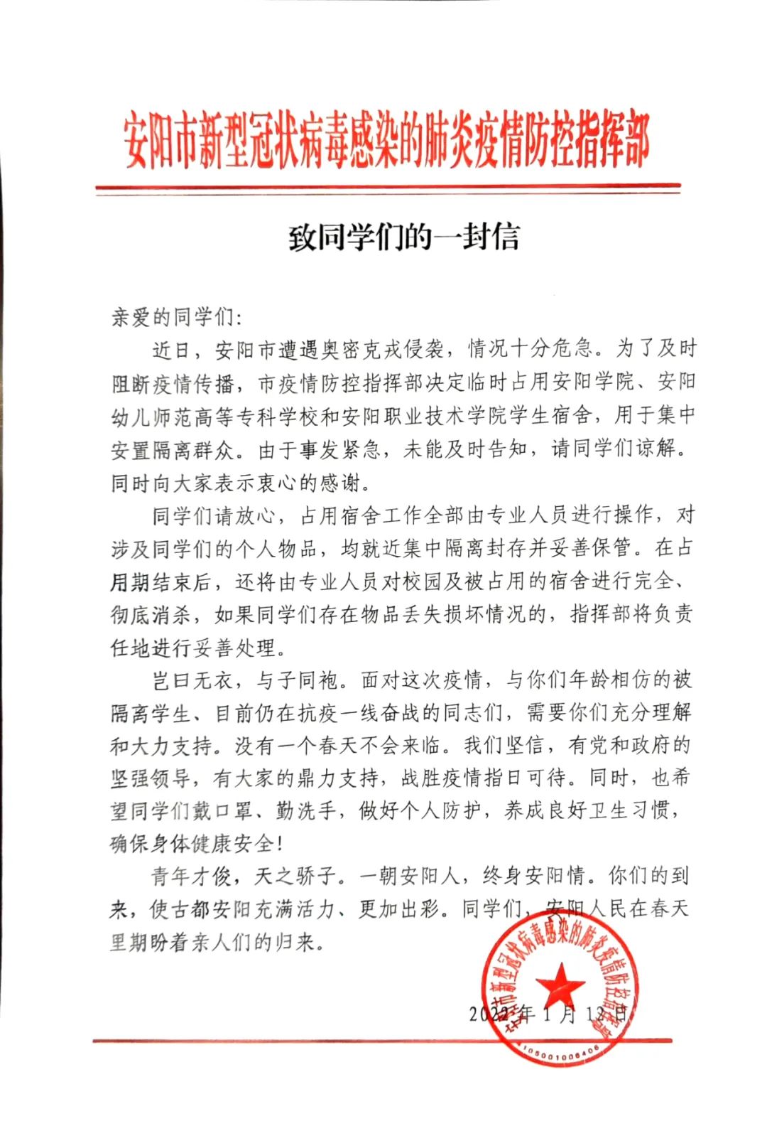 1月12日,一封来自安阳市新冠肺炎疫情防控指挥部的信,暖了广大安阳市民的心。这封信的收信人是安阳学院、安阳幼儿师范高等专科学校和安阳职业技术学院的广大学生。原来,由于近日安阳市遭遇奥密克戎袭击,情况十分危急,为了及时阻断疫情传播,安阳市疫情防控指挥部临时占用了这三所学校的学生宿舍,用于集中安置隔离群众。