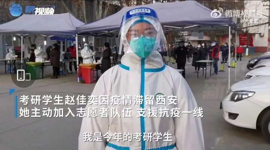 赵佳奕是今年参加全国硕士研究生考试的一员,受疫情影响,暂时滞留西安。考试结束后,她主动加入西安民航社区志愿者队伍,穿上防护服,成为抗疫一线的“大白”。
