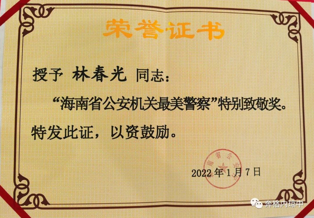 海南琼中公安林春光荣获“海南省公安机关最美警察”特别致敬奖