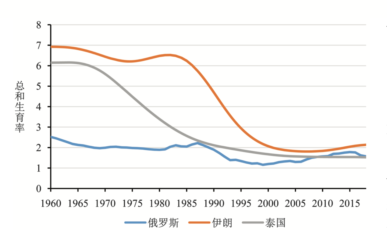 蓝色曲线为1960年到2018年俄罗斯总和生育率的演变。图源:《国外生育支持理论与实践研究进展》论文配图