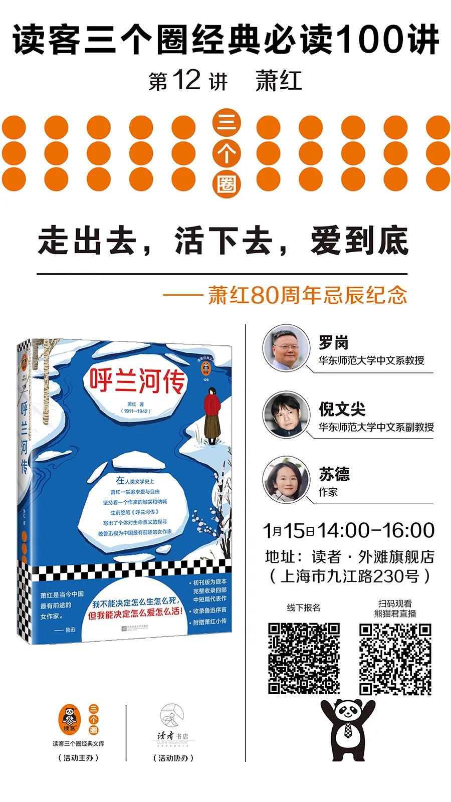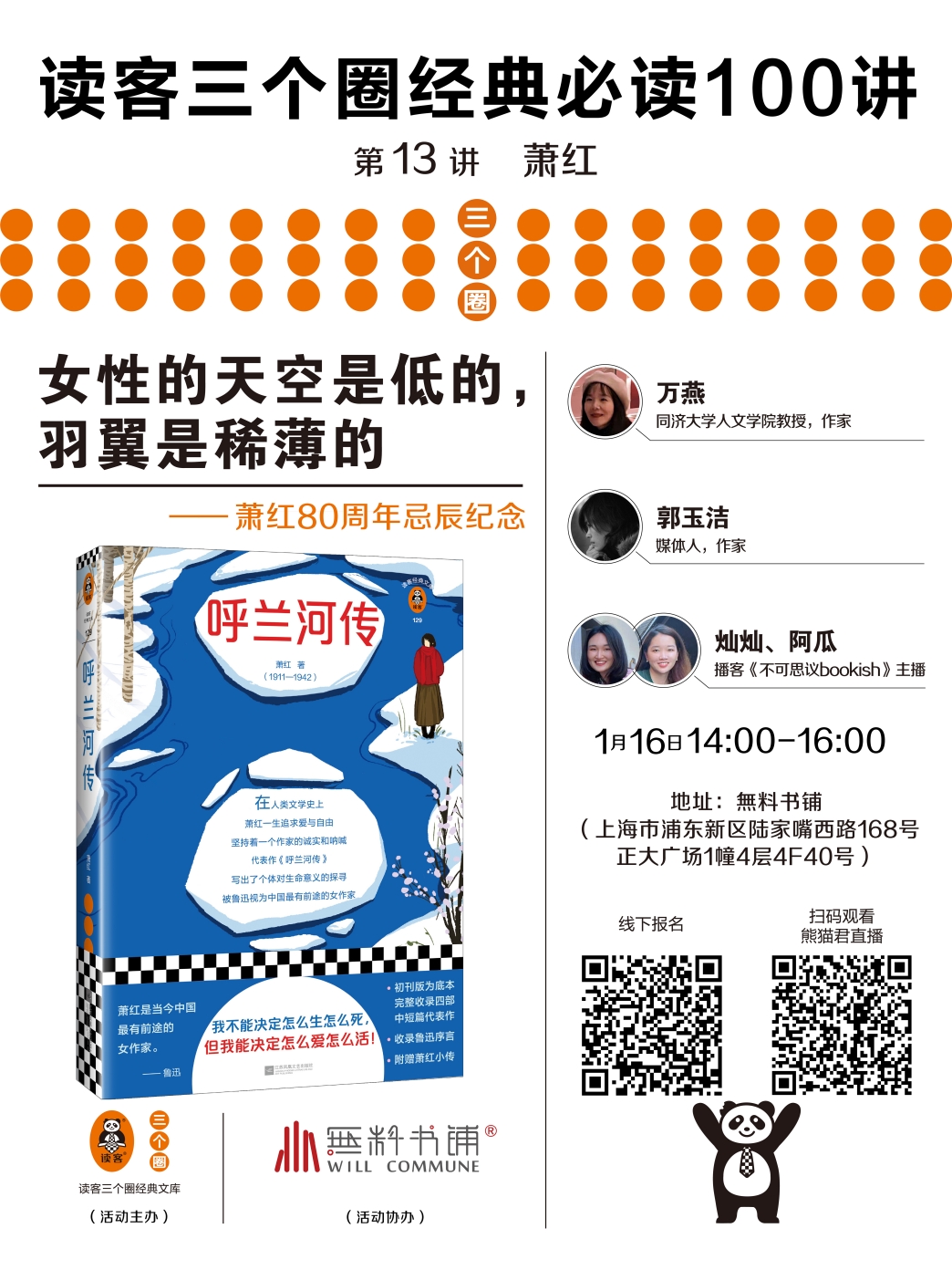 一身才华却一生飘零,萧红渴望爱和温情,却从未感受过亲情的温暖,更不知如何爱人,就这样辗转在一个又一个以保护者姿态出现的男人之间,最后让自己遍体鳞伤。在萧红的眼中,“女性的天空是低的,羽翼是稀薄的。”萧红离去的八十年后,中国的女性又拥有怎样的天空和羽翼?1月15日,让我们和罗岗、倪文尖、苏德一起,聊聊萧红的爱与漂泊,聊聊今天来阅读萧红最大的意义。